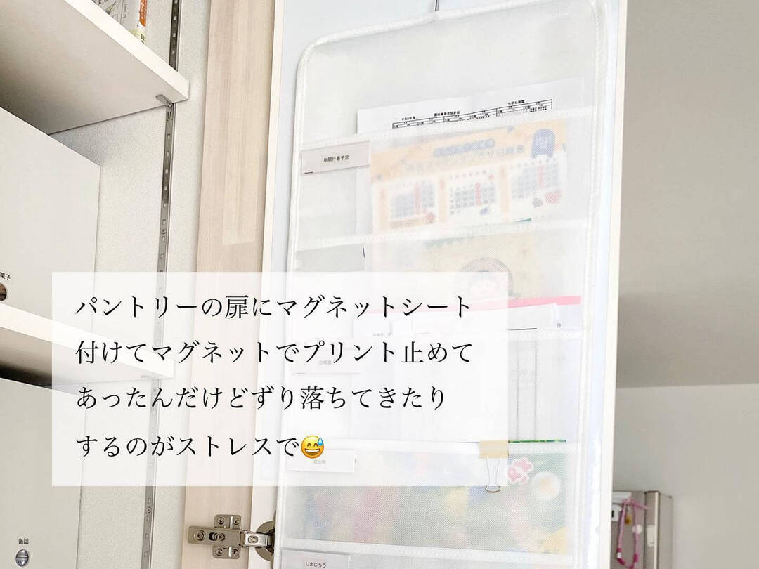 m_homeさんは家族みんなが目に入りやすいパントリーの扉に取りつけ。分類もできるので、きょうだいがいる場合や、学校や習い事などの種類別に分けたい場合でも便利ですよね。