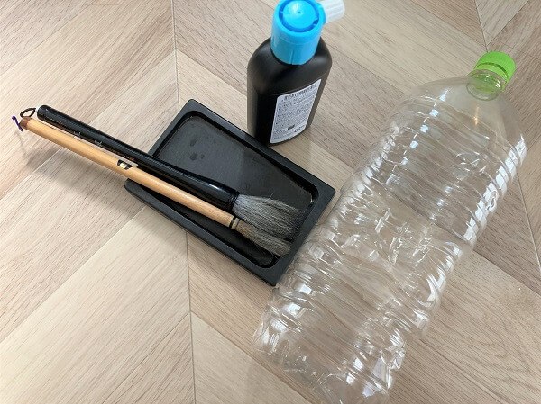 筆洗いに使うのは、こちらの2リットルサイズのペットボトルです。切り取ったり穴をあけたりするので、なるべく柔らかいものを使うのがおすすめ。わが家は「GREEN DA・KA・RA」のボトルを使いました。