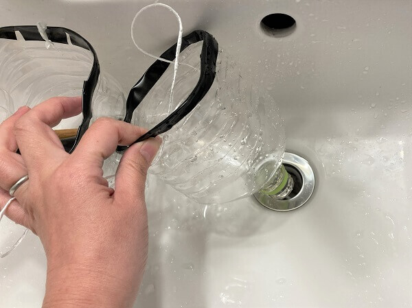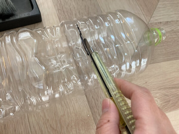 2リットルペットボトルを上から1/3ぐらいの位置に印をつけ、カッターで切り離します。飲み口があるほうが筆洗いの本体になります。