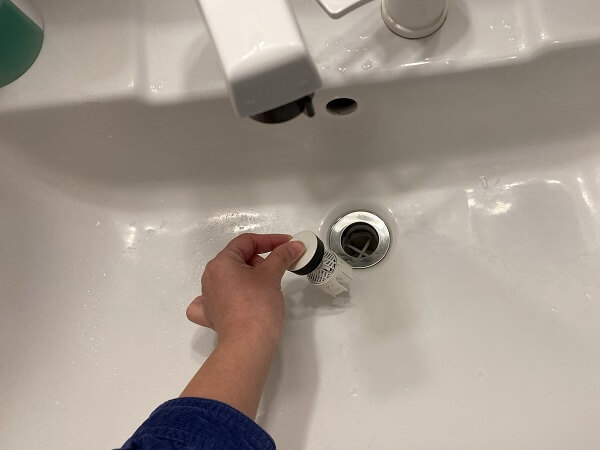 飲み口があるほうのパーツを排水口にはめます。水を溜めて洗いたい場合には、キャップをしたまま入れます。