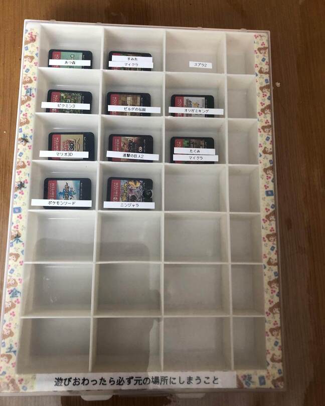 ふたの部分にゲームのタイトルと「遊び終わったら必ず元の場所にしまうこと」という注意を貼って、ありなしがひと目でわかるようにしています。