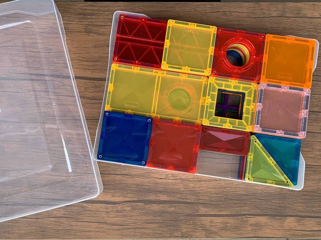 続いて、子どもに人気のマグネットパネル玩具「マグビルド」。ピッタリ収まっているのは、ダイソーの「A4ファイルホルダー」。220円商品です。
