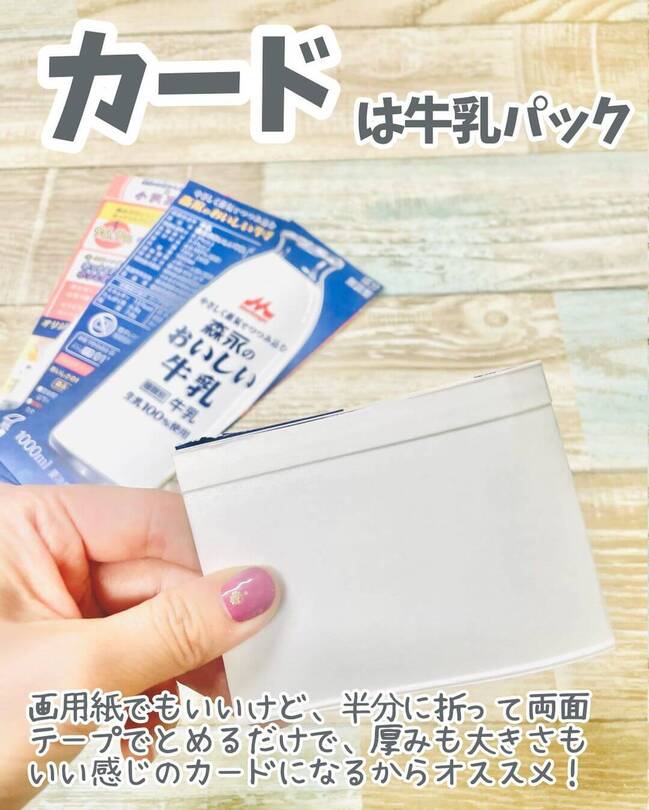 白い面が表になるように二つ折りにして両面テープで貼り合わせます。これで強度のあるちょうどいい厚みのカードになるんだそう。