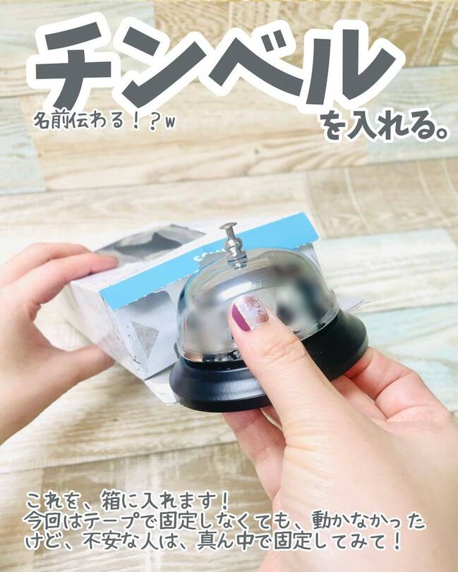ティッシュの箱にベルを入れます。取り出し口からベルの先が出るように設置。