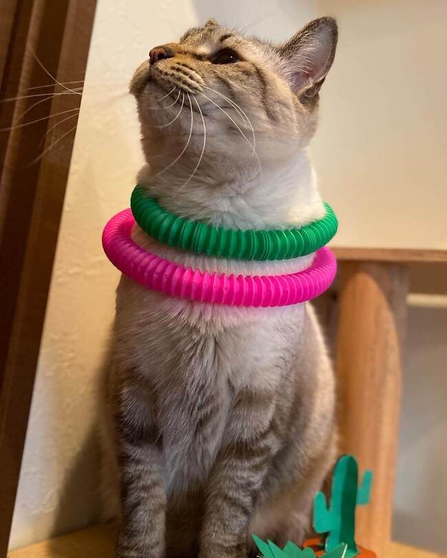 最後はポップチューブの首輪をつけたおしゃれなねこ♪伸び縮みするチューブなので、ぴったりサイズでとてもかわいいですね♡こんなところまで、人間界の流行にのせられてしまいましたが、まんざらでもなさそう!?