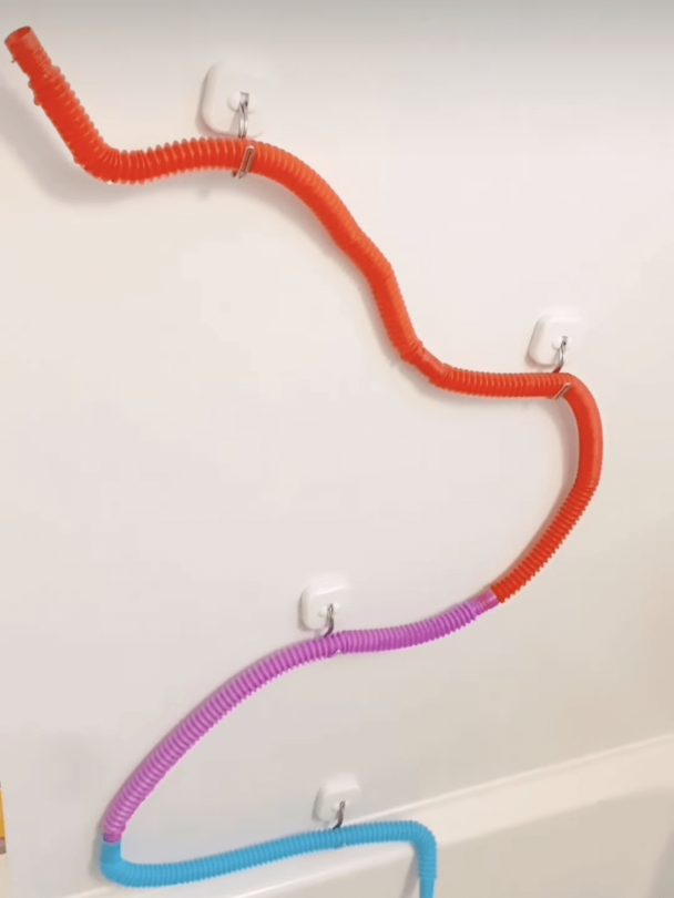 伸ばしたチューブをつなげてお風呂の壁にフックで取りつけ。チューブの中にお湯を流せばウォータースライダー遊びに♪