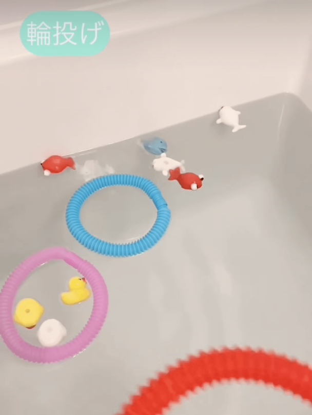 ぷかぷか浮かぶお風呂用のおもちゃも使って、輪投げ遊びを楽しむこともできますよ。お片づけもカゴに入れて乾燥させるだけと簡単なので、お風呂嫌いの子どもに一度試してみる価値ありです☆