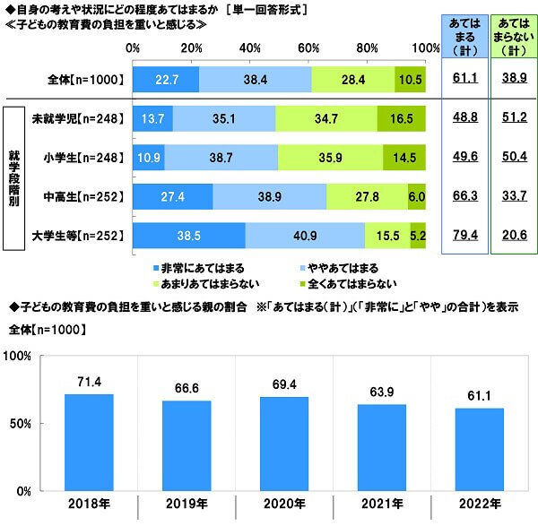 「子どもの教育費の負担を重いと感じるか」という設問では、「あてはまる(計)」が61.1%という結果に。