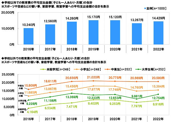 スポーツや芸術などの習い事、家庭学習、教室学習のそれぞれに1 か月あたりいくらくらい支出しているか聞き、それぞれの平均支出金額を合計したところ、14,429 円/月に。