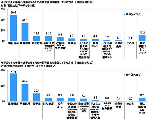 また、大学生等の親(予備校生・浪人生を含まない)(250 名)に、大学等への進学のための教育資金を、どのような方法で準備してきたか聞いたところ、「銀行預金」(71.6%)が最も高く、「学資保険」(44.4%)、「奨学金」(20.4%)、「財形貯蓄」「教育ローン」「子どもの祖父母(自分の親や義理の親)からの資金援助」(いずれも9.6%)が続きました。