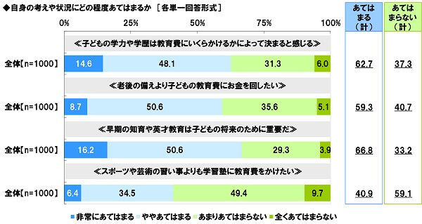 また、「老後の備えより子どもの教育費にお金を回したい」では「あてはまる(計)」は59.3%、「早期の知育や英才教育は子どもの将来のために重要だ」では「あてはまる(計)」は66.8%となり、老後の備えよりも教育費を優先したい親や、子どもの将来を考え早期教育という先行投資を重視している親が多いことがわかりました。