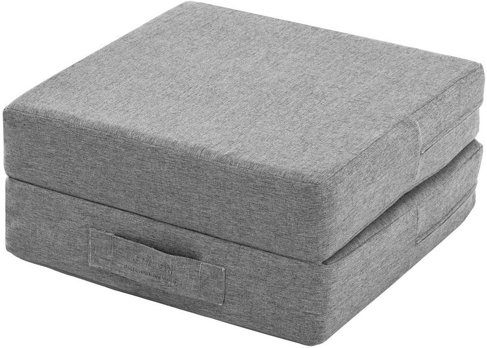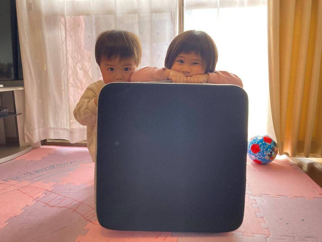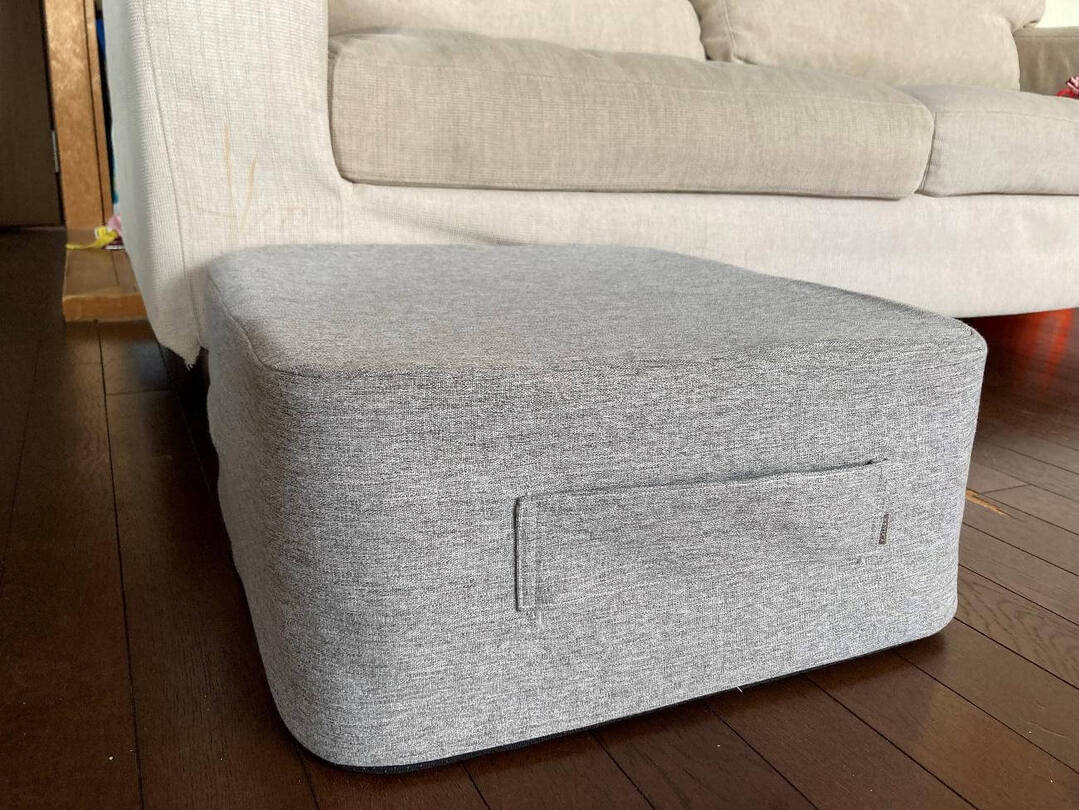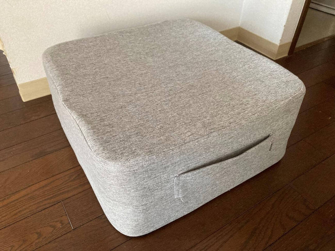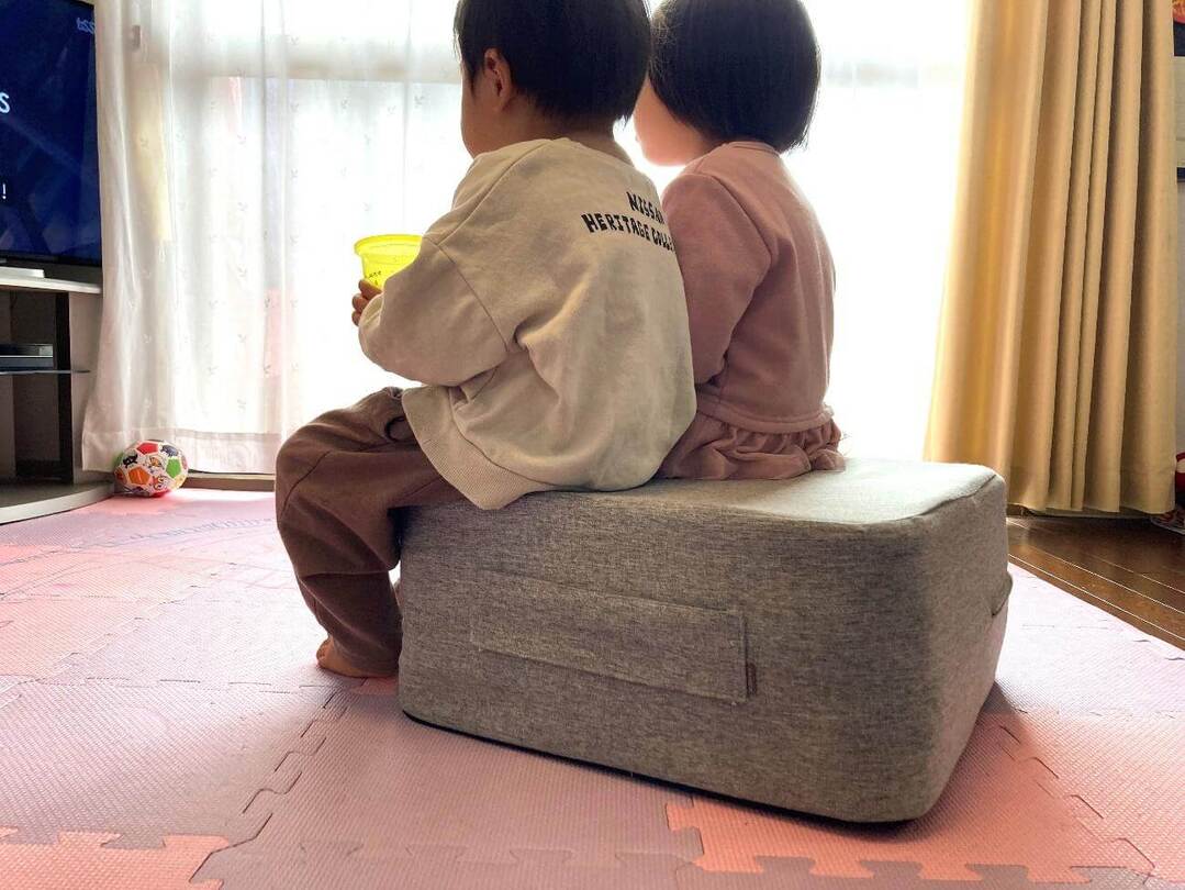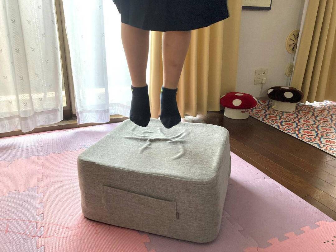 今回体験したKEYUCAの「トランポリンクッション」は、硬めのウレタンとバネのような弾力のあるクッションを重ねた4層構造。インテリアになじみやすいグレーで、運びやすい持ち手つき。手ごろな価格で、まずは試してみたいという家庭にぴったりです。