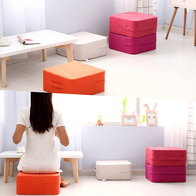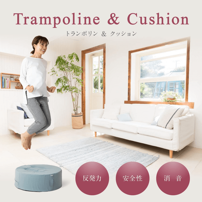 クッショントランポリンはミニトランポリンよりもコンパクトで、見た目はクッションなので、リビングに置きっぱなしでも自然とインテリアになじみます。運動に使わないときもそのまま出しておいてスツールとして使用できます。