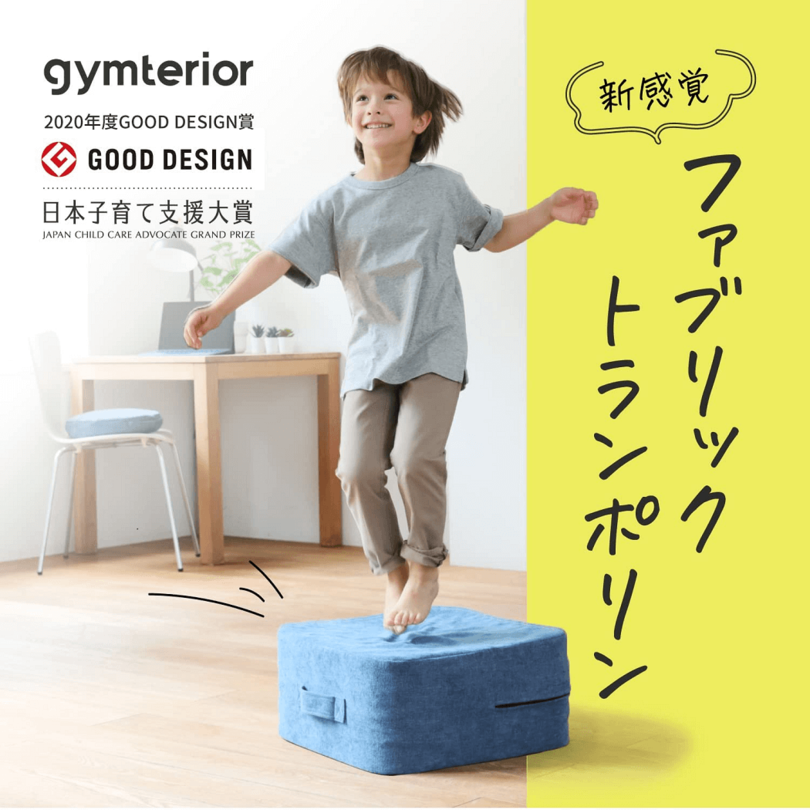 2020年度グッドデザイン賞や日本子育て支援大賞を受賞したクッショントランポリン。よく跳ねつつも体への負担が軽くなるよう、衝撃吸収クッションと高反発素材を使用しています。跳ぶときの目安となる"まとシール"も付属。カラーは全3色。