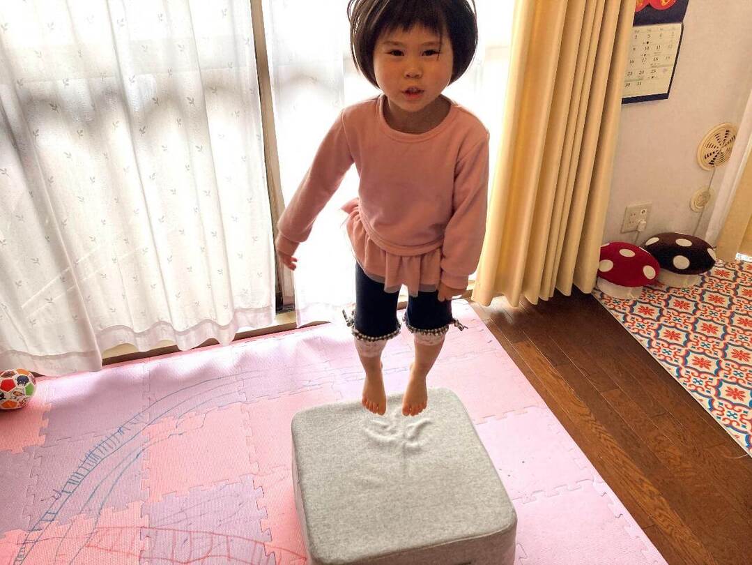 ぴょんぴょんとよく跳ねるようで、年中の次女は「気持ちいい!」と、爽快感を感じた様子。跳ぶのに疲れたらクッションの上にごろんと寝ていました。確かに、横になりたくなるくらい、肌触りもいいです。