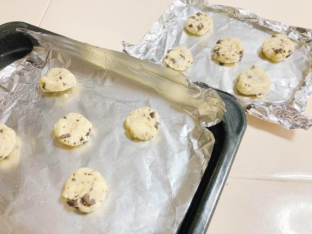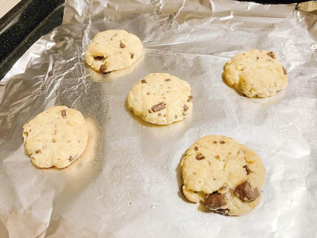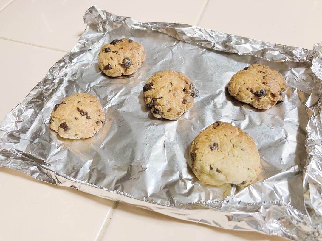 生地を10等分して手で丸めてアルミホイルに並べます。トースターだけで焼けるということですが、今回は比較のためにオーブンでも焼いてみました。