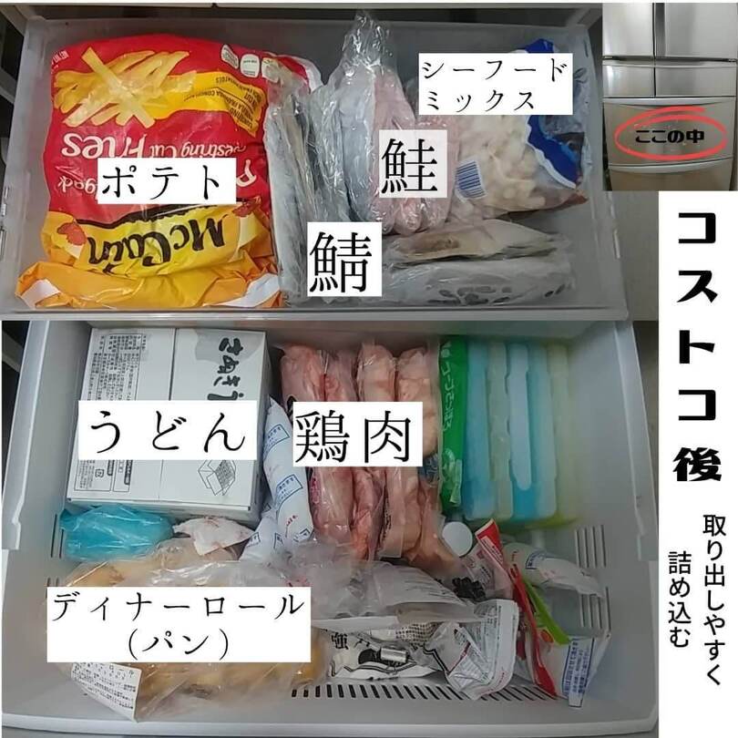 保冷剤などもなるべく立てておくことでまとめ買い後もスッキリ収納。整理収納アドバイザーの資格を持つみきちさん、まるでパズルのように購入したものをきっちり詰めるそうです。大容量タイプも多いコストコの食材がしっかり収納されている様子はアッパレ!