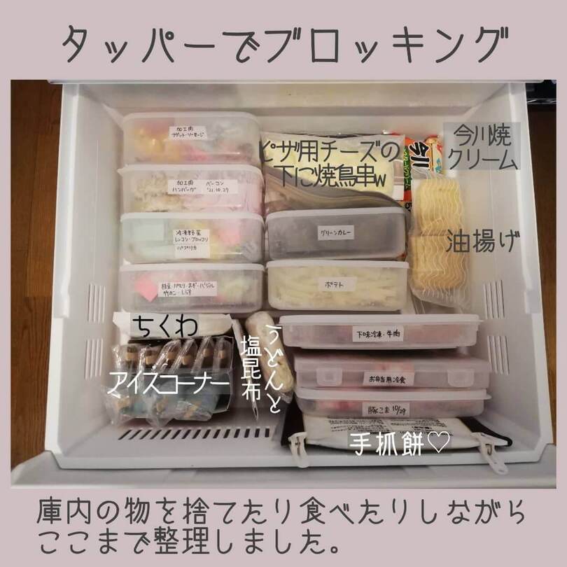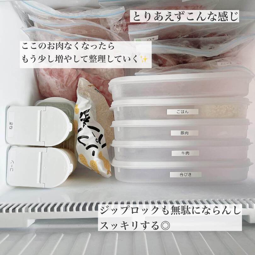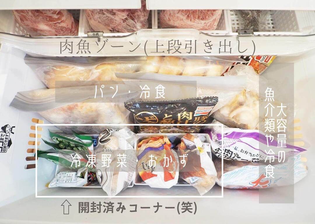 miyukiさんは冷凍庫の手前に「開封済みコーナー」を作って、使いかけのものが行方不明になるのを防止!ストックも一目瞭然です。