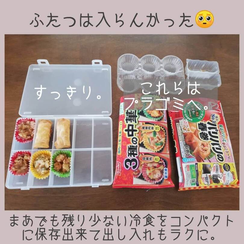 一度にすべてを使い切ることが少ないお弁当のおかずは、100均の仕切りケースに並べることで、省スペースに。何がどれだけ残っているかがすぐにわかりますね!