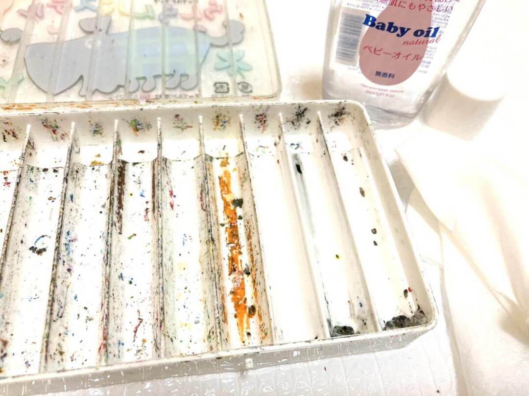 まずはベビーオイルでお手入れ。クレヨン本体とケースそれぞれを、ベビーオイルを含んだティッシュペーパーで拭いていきます。