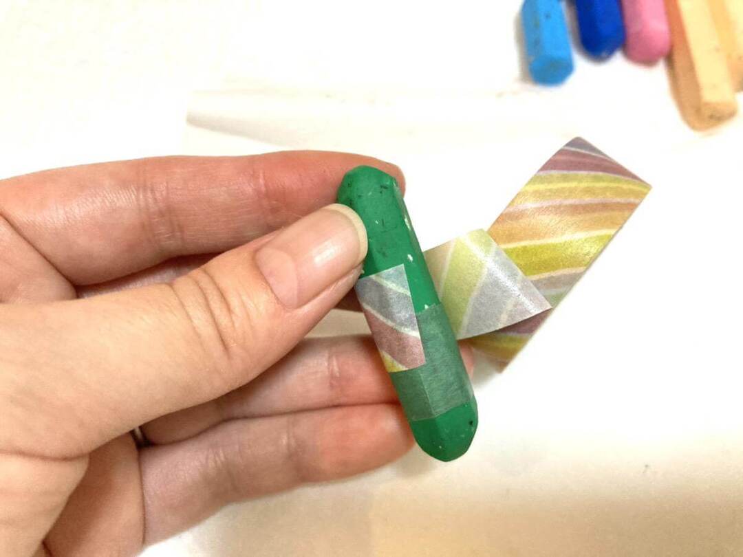 続いては、キレイになったクレヨンを今後使いやすくする方法です。 むき出しになったクレヨンにマスキングテープを巻いて、新しい巻紙の代わりにしていきます。