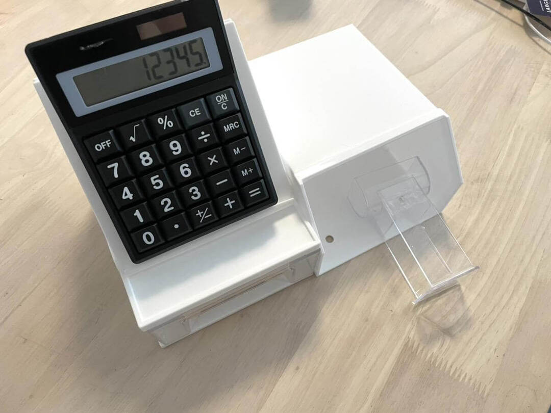 本物の電卓がついているだけで、リアリティがあって良い感じになりました。プルケースに電卓を取り付けるだけでも、簡易レジとして使えますね。