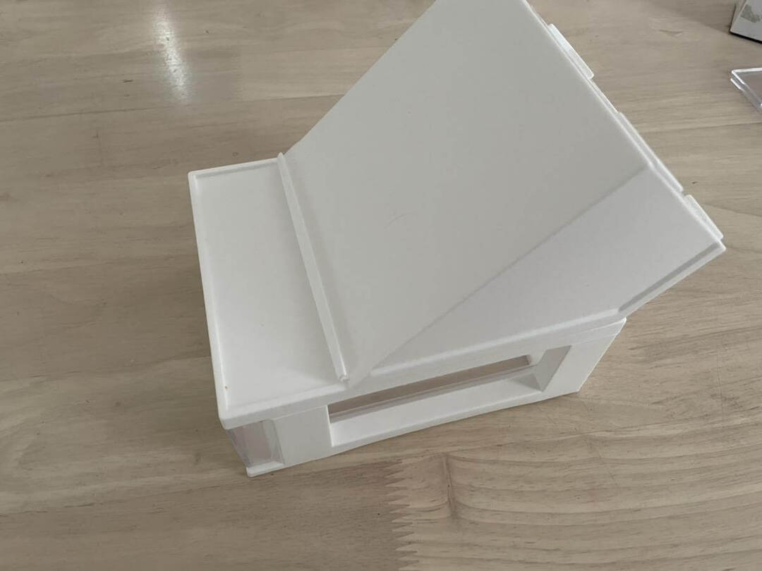 DESK LABOシリーズの「プチポケット」をひっくり返して、プルケースの上に設置します。今回は遊び終わったあとにすぐバラせるよう、固定はセロテープで行いました。本格的なレジにするなら、接着剤や両面テープなどで固定してくださいね。