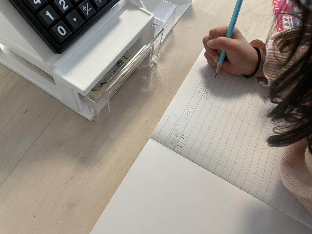 そこでダイソーのお小遣い帳といっしょに使ってみることに。引き出しにお小遣いを直接入れて、電卓を使いながらお小遣いの計算&記入!