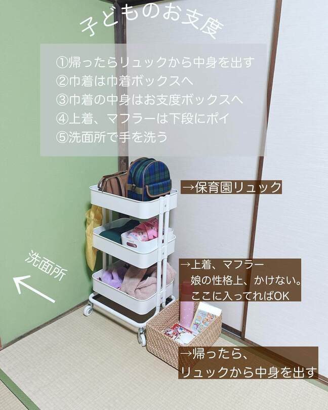 帰宅したら、脱いだ上着は壁のフックにかけ、通園リュックはリュックの中身を出してワゴンの1番上の段に置き、リュックはワゴンのサイドにかける…という一連の流れに。
