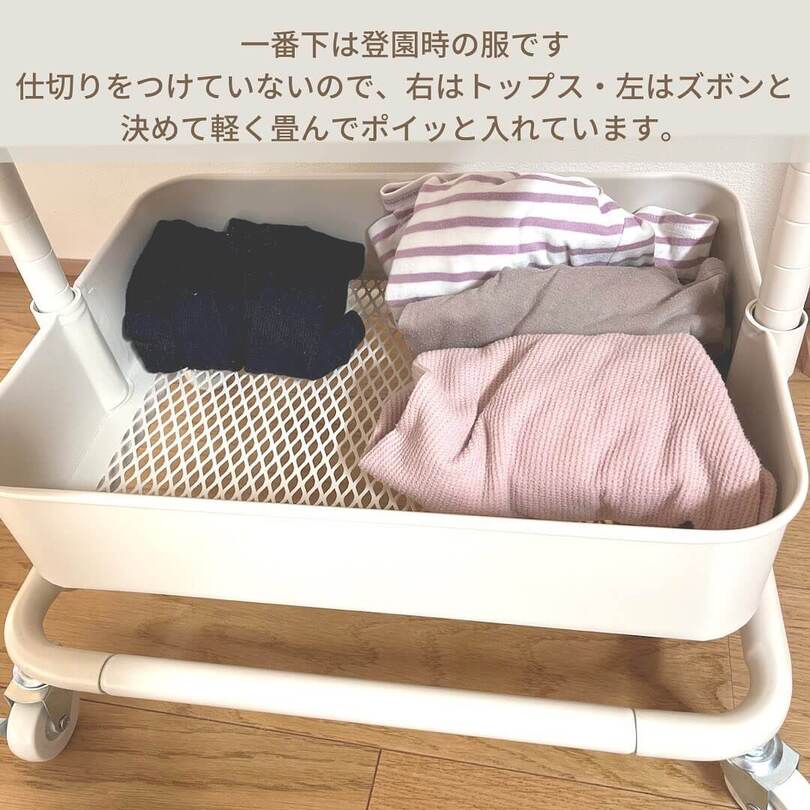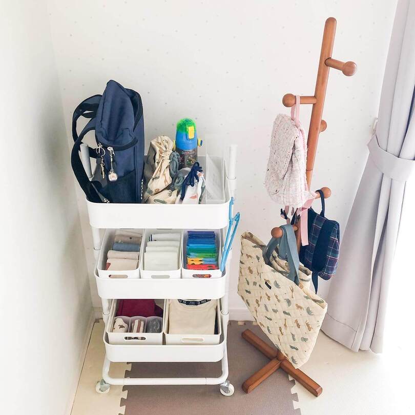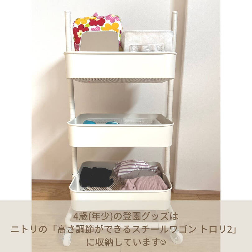 ニトリの「高さ調節ができるスチールワゴン」を使い、このコーナーを作ったことで、自分で準備をしてくれることが増えて、忙しい朝のママの負担が減ったそう!