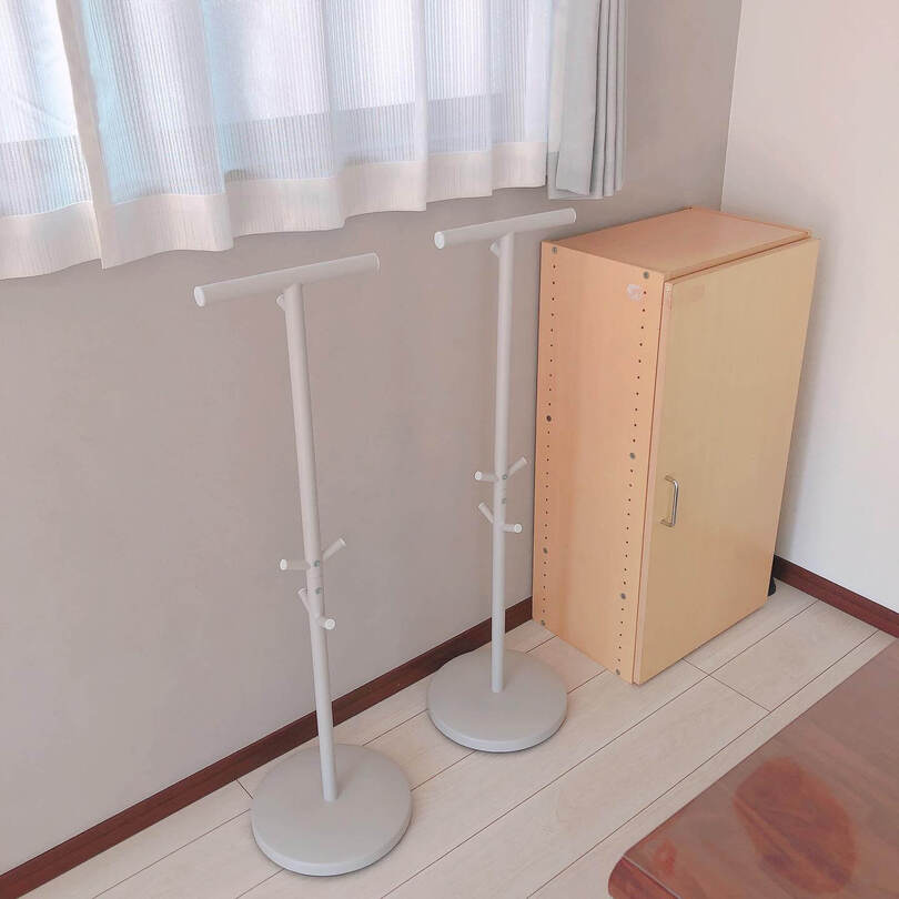 棚を置くと左右にすき間ができるので、無印の「横ブレしにくいフック」をひっかけて上着と帽子をかける場所に!自分でハンガーをかけているそう。