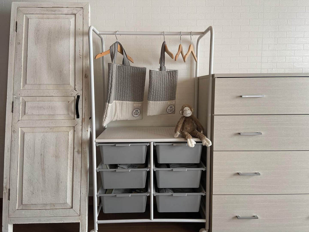 「LOWYA」で購入したキッズ用のハンガーラックは、下段に引き出し付きの収納ボックスが6個付いていて収納力も抜群!通園グッズをひとまとめにできますね。