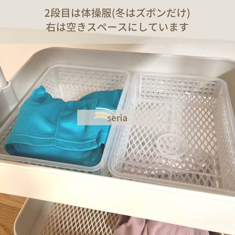 真ん中の段にはセリアのトレイを2つ設置して体操服置き場に。