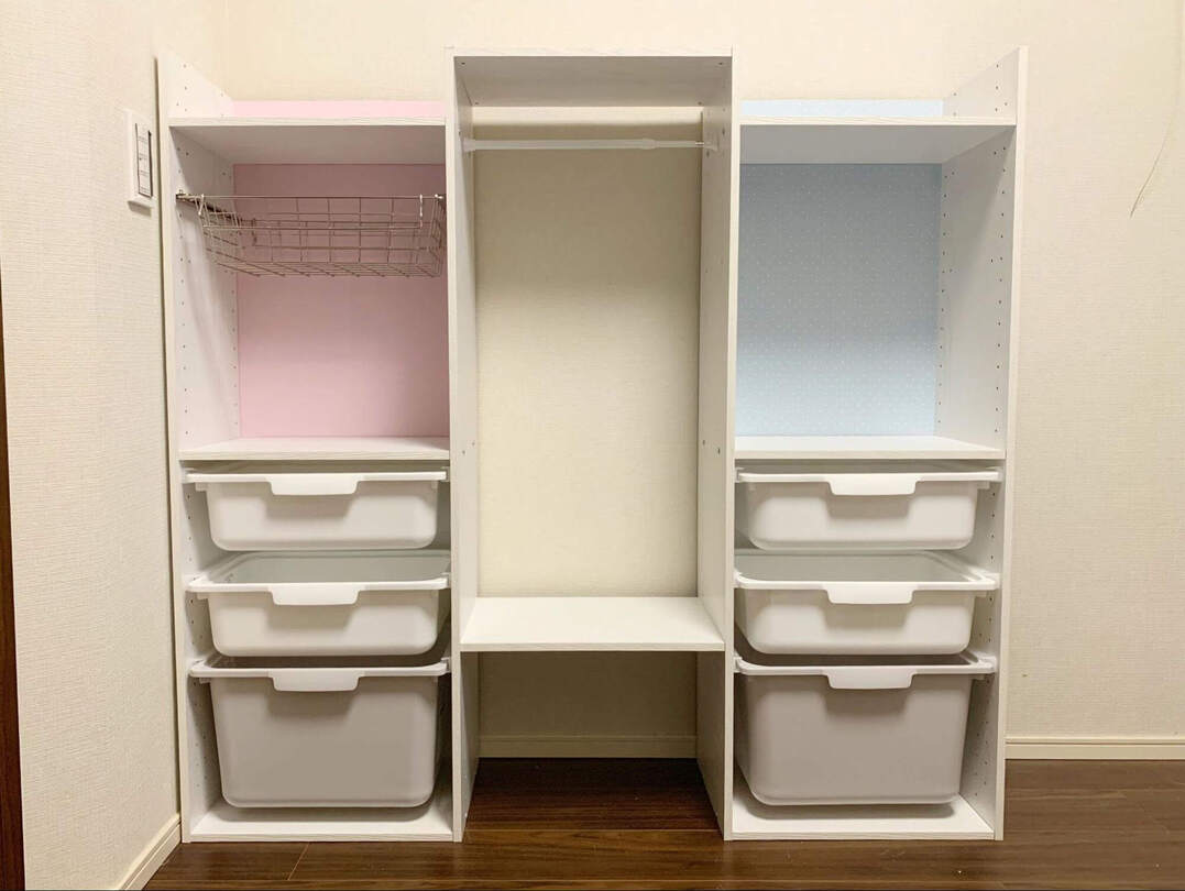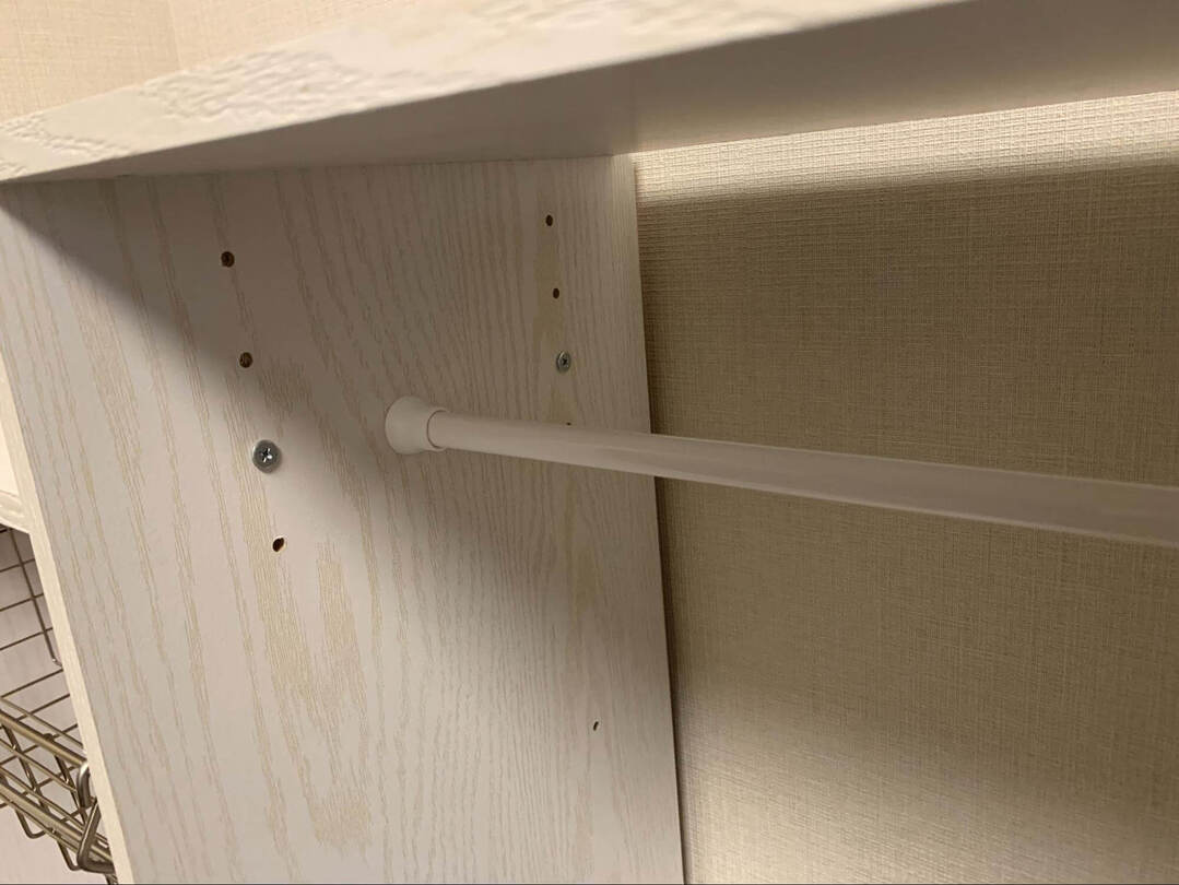 フレームができあがったら、収納ボックス、バスケット、ハンガーをかける突っ張り棒を設置します。