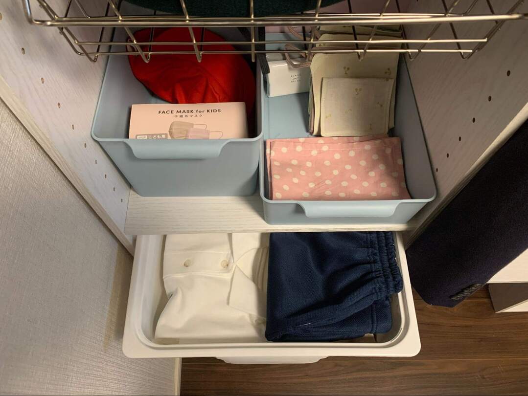 オープンスペースには、セリアのラッセルバスケットを使って、タオルやハンカチ、ティッシュ、ランチョンマット、マスクなどを自分で取れるようにセット。