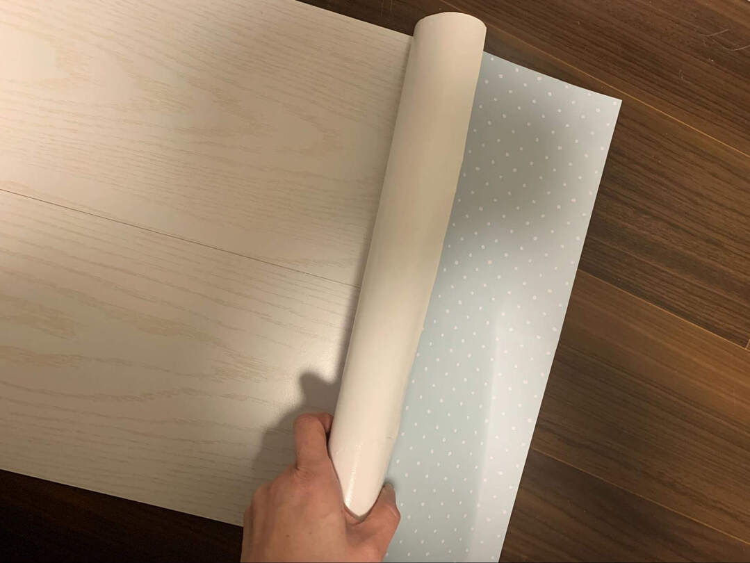 背板の端からぴったりと貼っていきます。できるだけ空気が入らないようにぴったり粘着させます。商品の説明書きには、仕上げにタオルなどを使ってすべらせるとよいとコツがありました!