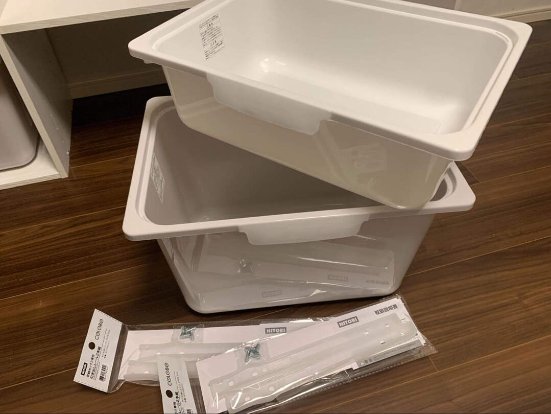 こちらがNカラボにぴったりの収納ボックス。棚板の上に置くだけでもよいですが、引き出せるようにするには専用のレールが必要です。
