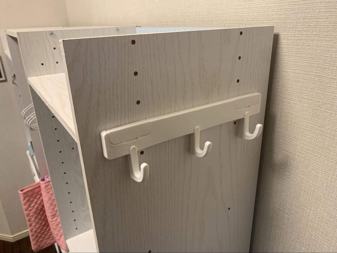 できあがった後で、側板にフックを付けるとさらに収納力がアップするかも!と思い、ダイソーで購入したカラボ側面に取り付ける3連フックを設置してみました。
