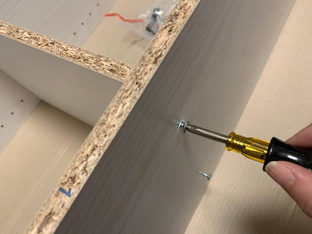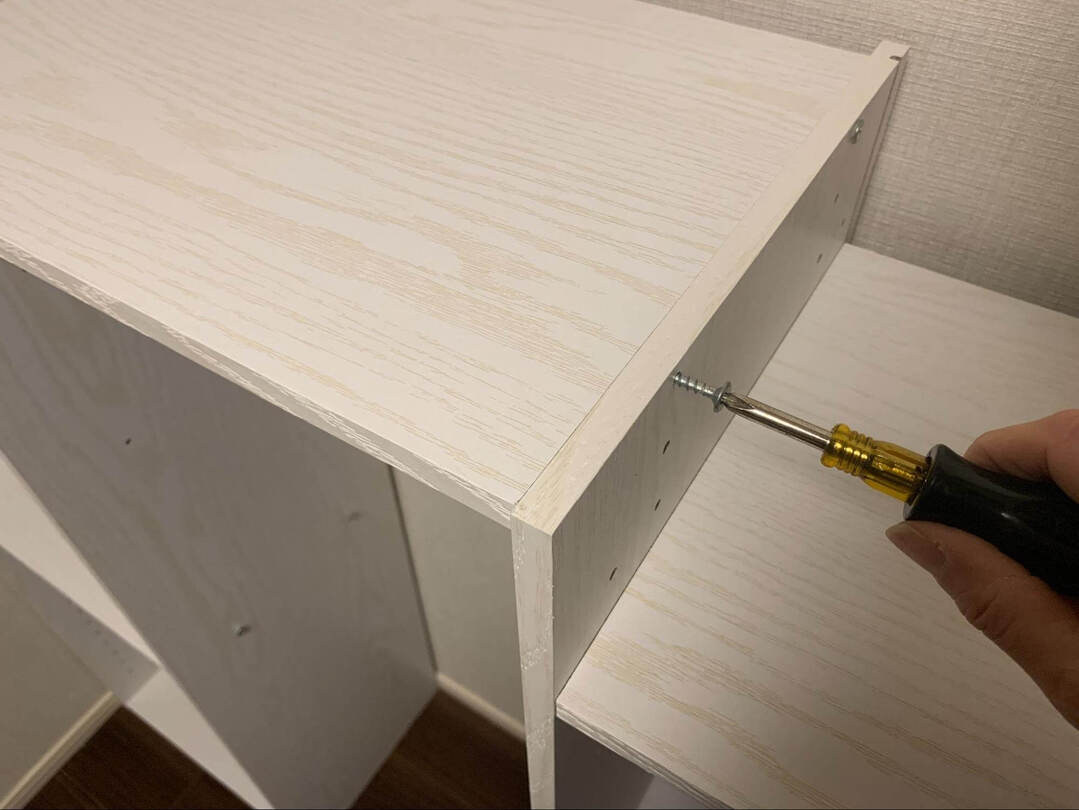 まずは側板と上面、底面、固定棚を組み立てます。背板はアレンジでインテリアシートを貼るため、あとで設置します。