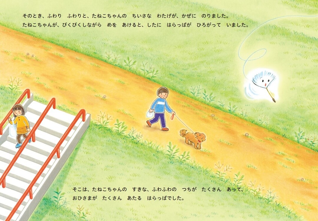 『たんぽぽのちいさいたねこちゃん』は、たんぽぽの綿毛が主人公。きょうだいたちが風に乗って旅立ってしまったのに、たねこちゃんは自信がなくて行動できません。でもある日突然、旅立つことになり、冒険がはじまります。たねこちゃんには、たくさんの試練が待ち受けていますが、無事、花を咲かせることができるでしょうか?