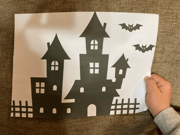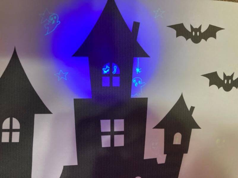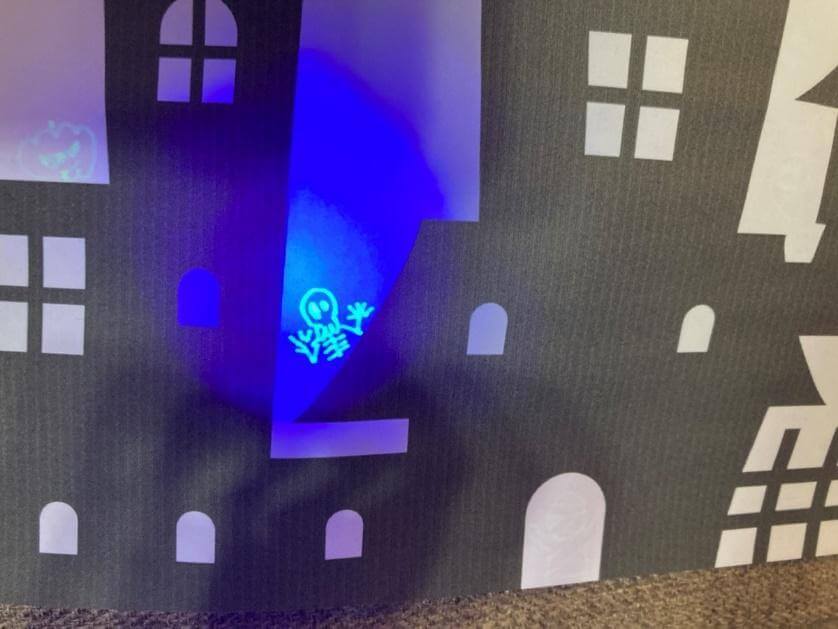 つぎに紹介するのは「おばけ探し」です。いかにもおばけが出てきそうな屋敷のイラストをコピーして、あちこちにマジックライトペンでおばけを描いていきます。「おばけ探ししてみて!」と渡すと…。