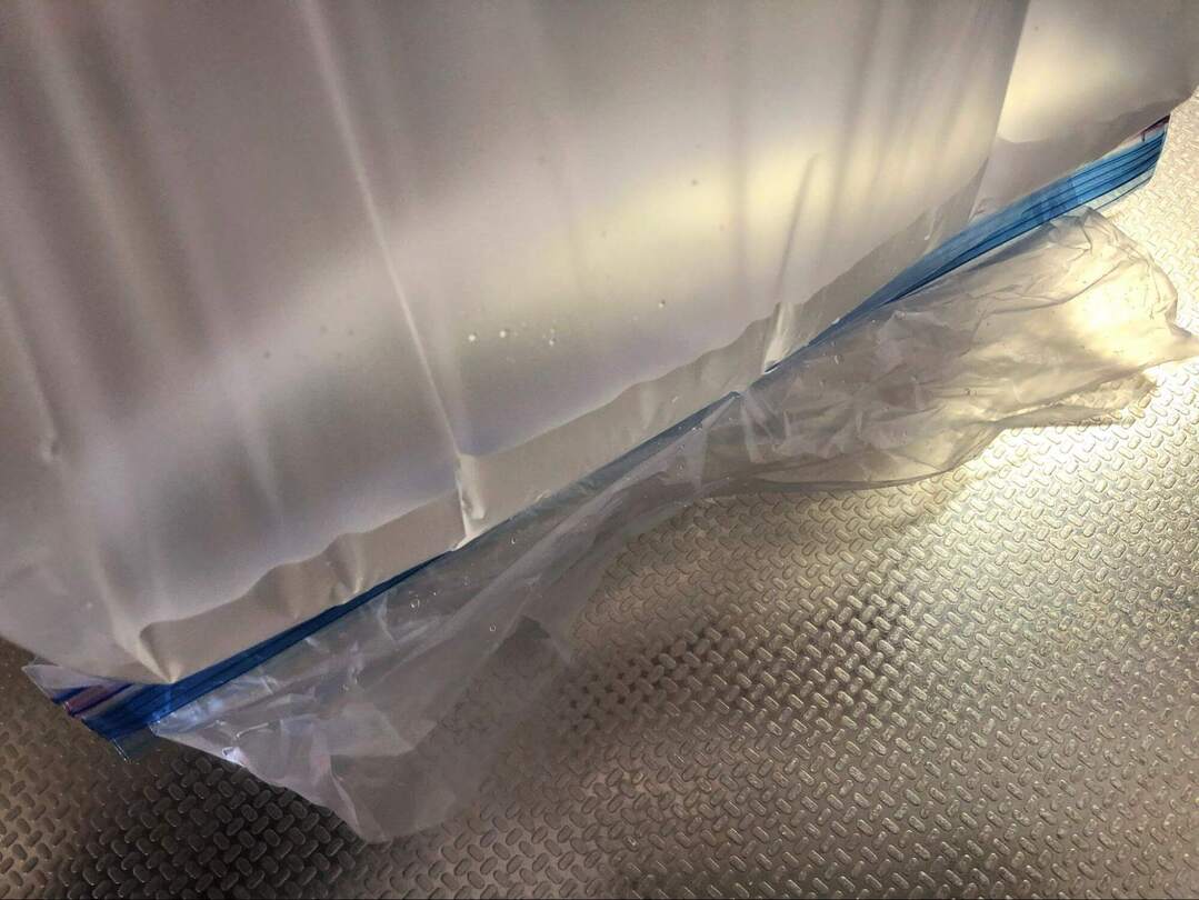 次に、水をいれて逆さにした場合どこまで水圧に耐えきれるのかを検証!ジップロックは1Lの水でも耐えられましたがジッパー+ポリ袋は1Lには耐えられず。