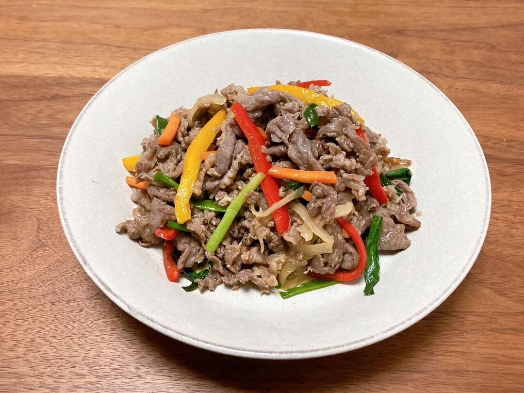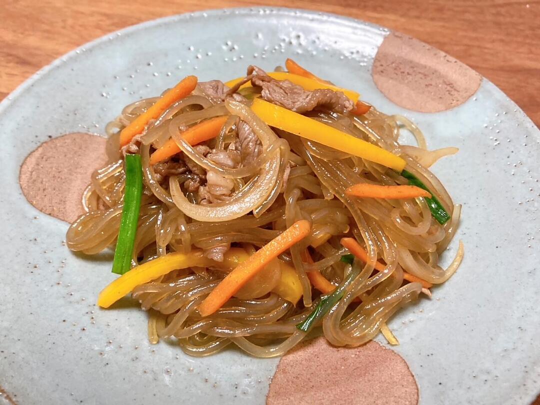 牛肉とにんじん、パプリカ、小ねぎ、玉ねぎを炒めました。牛肉の旨味が春雨にしみこんだ、ご飯の進む味!ご飯にのせて丼ぶり風にして食べるのもいいですね。