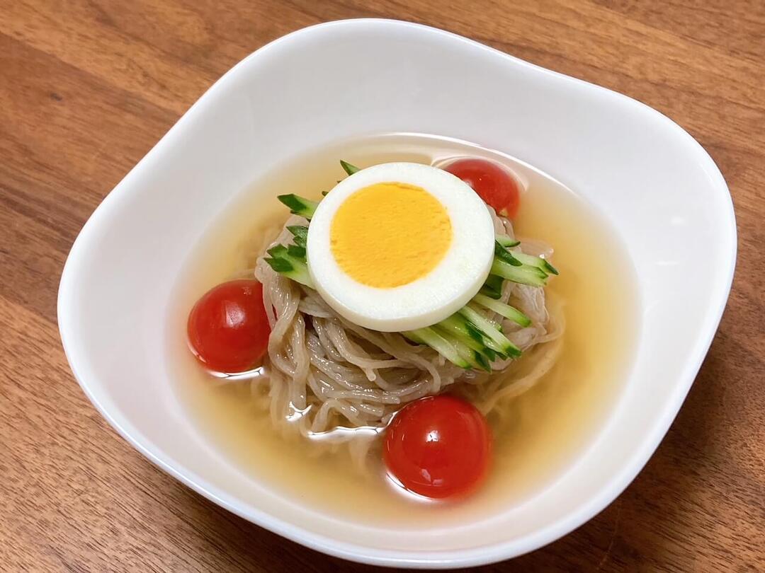 さっぱりつるつるっと食べられる冷麺。乾麺を茹でて、濃縮スープと冷水を混ぜてかけるだけで完成します。トッピングはお好みでOK!きゅうりやゆで卵などがおすすめです。