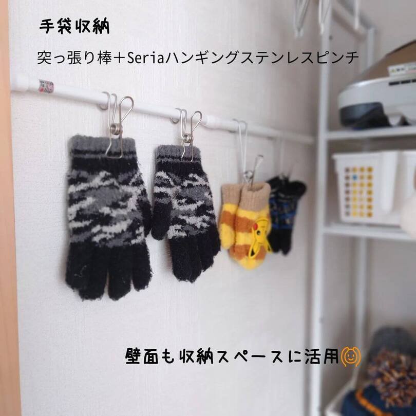 さらに側面の壁には突っ張り棒を取り付けて、迷子になりやすい手袋などの小物収納に!