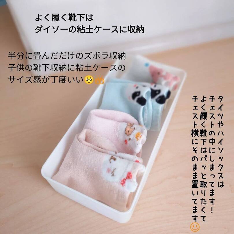 また、子どもの小さな靴下は収納に困りがちなアイテムのひとつですが、なんと二つ折りにしたサイズが粘土ケースにぴったりなんだとか!毎日履く靴下はお出かけ前に急いで取り出すシーンも多いので、しまい込まないのが正解ですね。