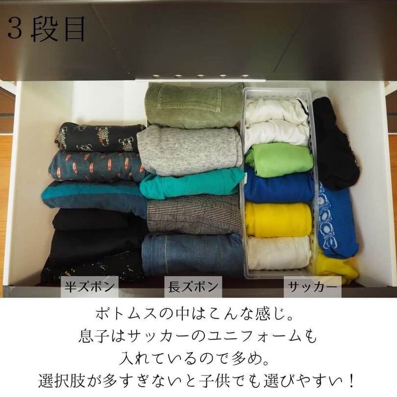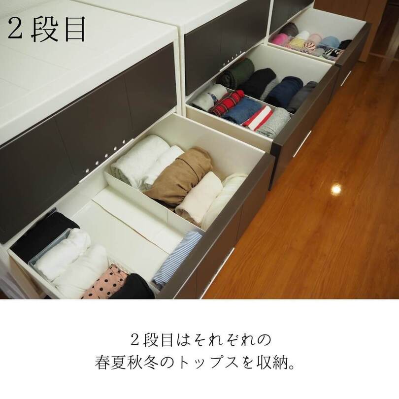 2段目にはトップス、3段目はボトムスを。重ねず、仕切りを使って、上から見てどの服かがすぐにわかるようになっています。 季節を問わず一か所に収納できることで、シーズンごとに入れ替える必要がなく、気温が微妙な季節の変わり目のコーディネートにも便利ですね。