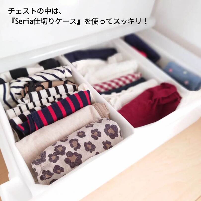 チェストの引き出しにはセリアの仕切りケースを使って、ぐちゃぐちゃにならないしくみ作りを。