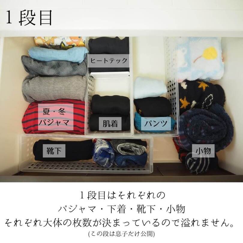 1段目には下着や靴下などをケースを使って収納。小物はどうしても増えがちですが、スペースを決めてそれ以上増やさないようにすれば、ぴったり収まりいつでもスッキリ。