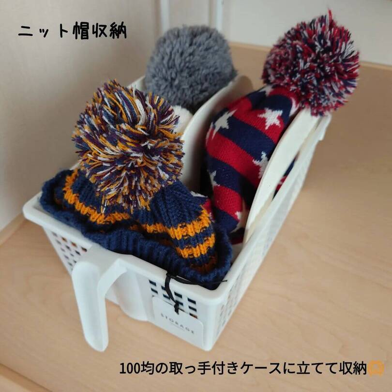 100円ショップならどこでも売られている「取っ手付きケース」には、これまた収納に困るニット帽を!ダイソーのブックスタンドをしきりにすることで、立てて収納できひと目でわかるように。